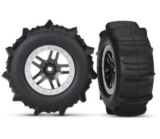 Traxxas paddle tires offer unbeatable traction in sand, snow, mud, or any loose surface. Paddle tires feature outrageously strong scoops combined with strengthening ribs and TSMĀ®-rated glue joints to provide a whole new dimension in traction and off road fun. Tires come pre-glued and mounted with foam inserts to black Split-Spoke SCT wheels with satin chrome beadlock-style trim.